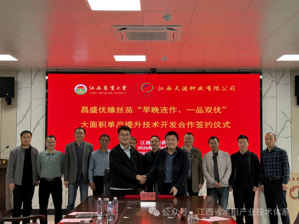4月8日上午,体系栽培团队与江西天涯种业有限公司举行优质稻品种“昌盛优臻丝苗‘早晚连作、一品双优’大面积单产提升技术开发合作”签约仪式。体系首席曾勇军、江西农业大学农学院原党委书记方加海、体系栽培岗位专家曾研华、江西天涯种业有限公司总经理张少虎,以及体系栽培团队主要成员、企业相关负责人参加签约仪式。
