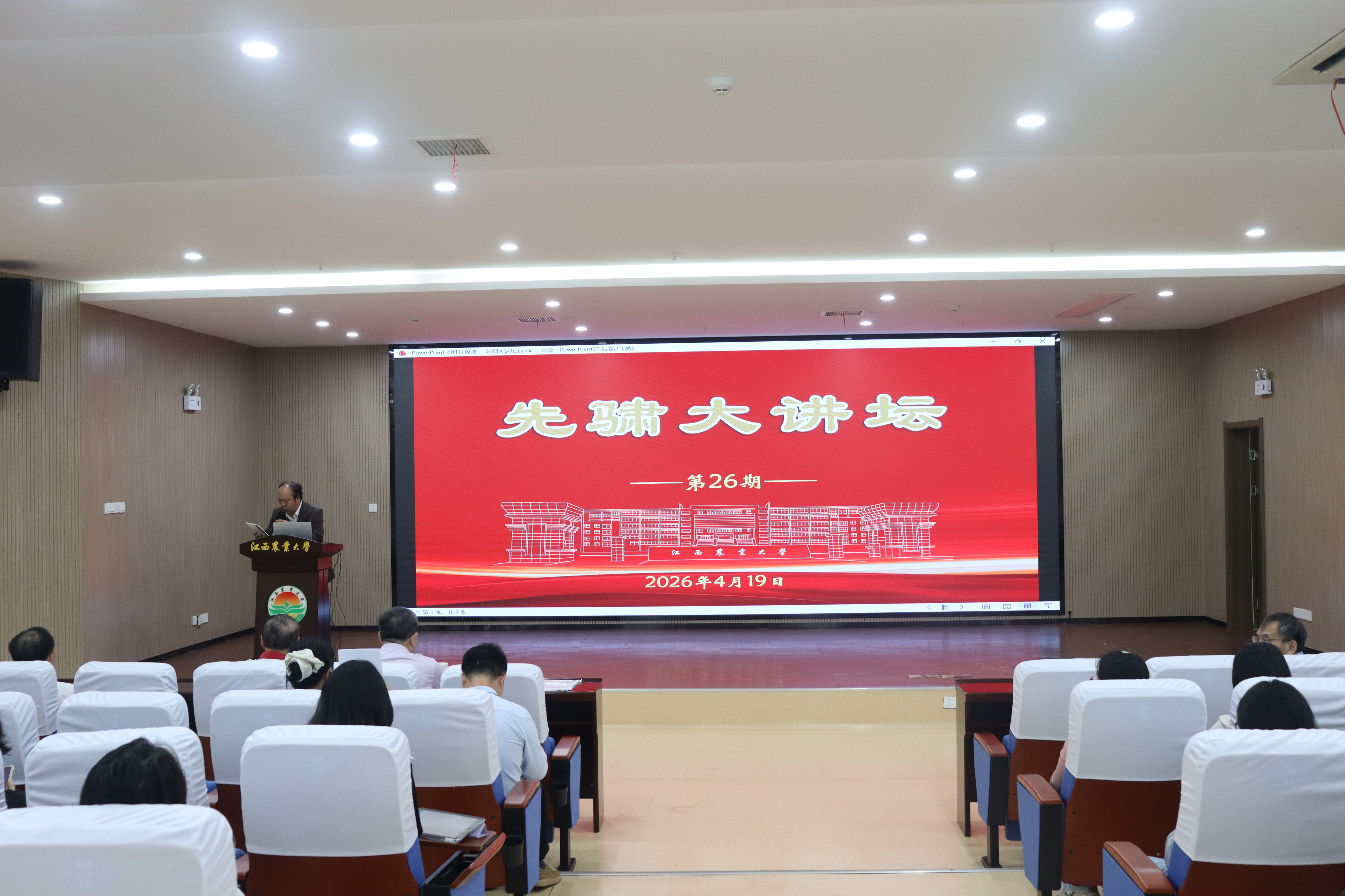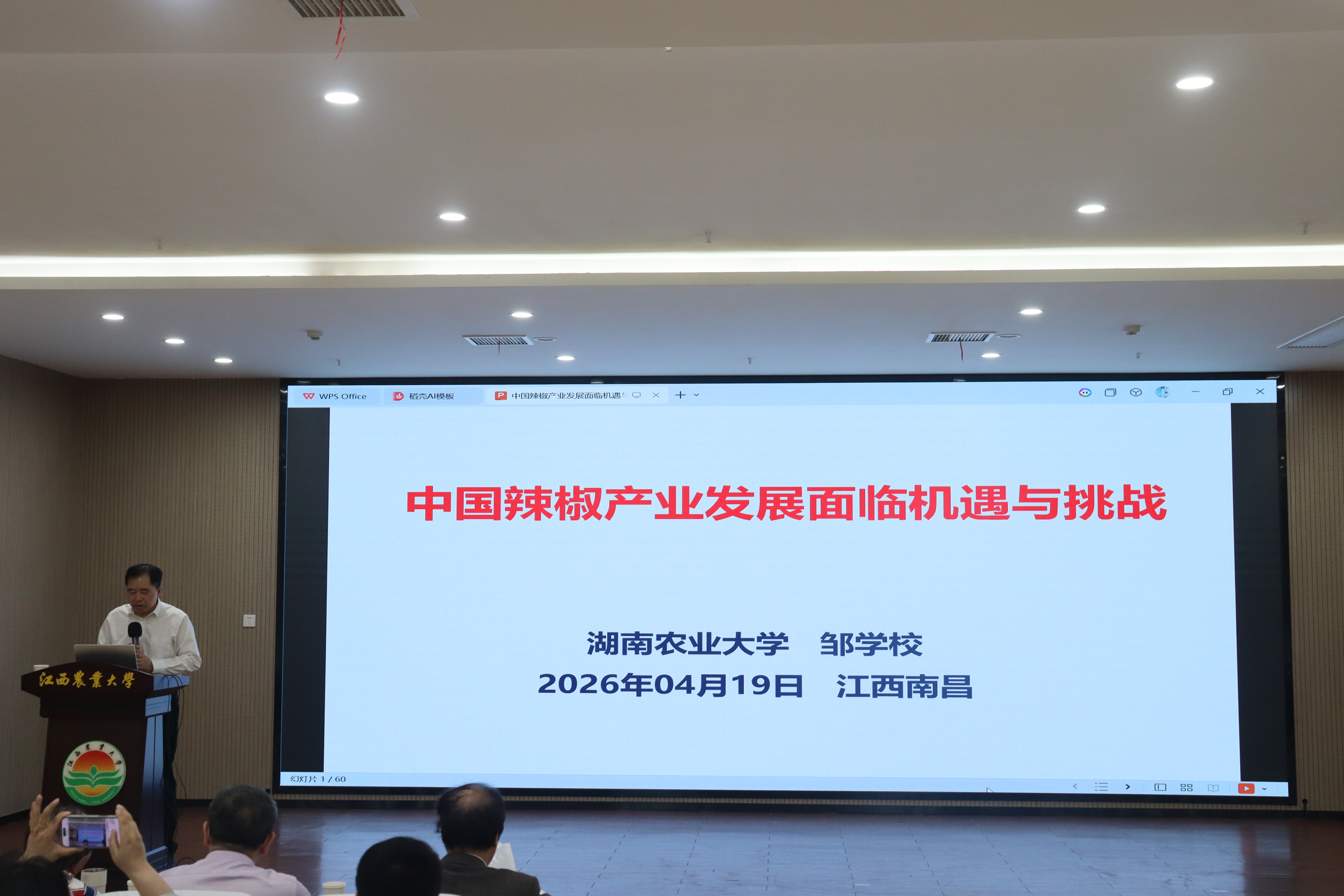 2026年4月19日上午,江西农业大学“先骕大讲坛”第26期在逸夫图书馆南一楼报告厅举行。中国工程院院士、湖南农业大学邹学校教授应邀作题为《辣椒产业发展现状与趋势》的专题报告。本次开讲由江西农业大学科技处主办,农学院、果蔬贮藏与保鲜江西省重点实验室、蔬菜高质高效栽培及利用江西省重点实验室共同承办,吸引了校内众多师生参与。