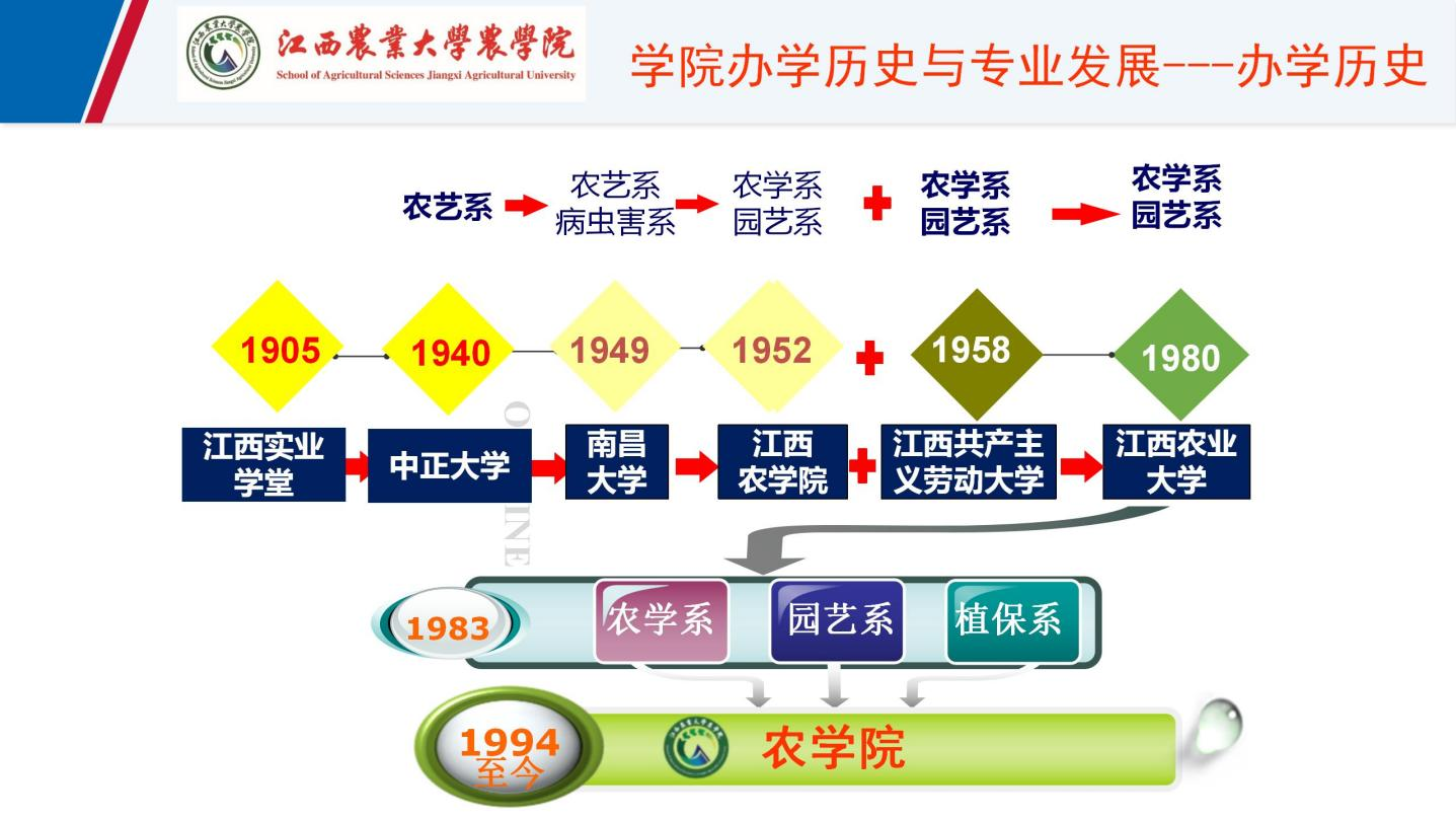 农学院溯源于1905年的江西实业学堂,本科教育肇始于1940年创办的国立中正大学农学系,与学校的办学历史一脉相承。1994年5月25日,江西省教育委员会批复同意我校在农学系、园艺系、植保系基础上建立农学院。百廿载薪火赓续,双甲子躬耕报国,历经120载传承和发展,农学院现有1个博士后科研流动站,2个一级学科博士点,4个二级学科博士点,4个一级学科硕士点,2个农业硕士招生领域,7个本科专业,3个国家一流专业建设点。
