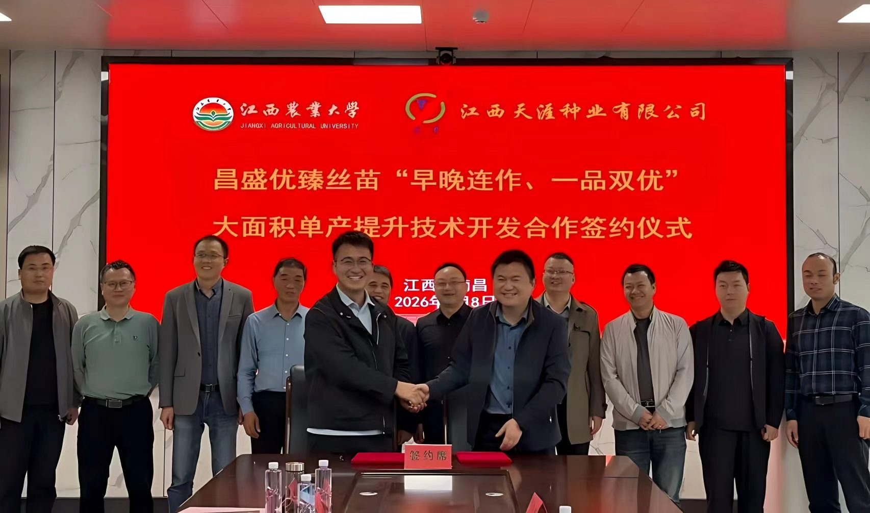 4月8日,我院水稻栽培科研团队与江西天涯种业有限公司签署技术开发合作协议,双方就开展优质稻品种“昌盛优臻丝苗‘早晚连作、一品双优’大面积单产提升技术”研发达成一致意向。副校长曾勇军、农学院水稻栽培科研团队主要成员、江西天涯种业有限公司总经理张少虎及企业相关负责人参加了签约仪式。