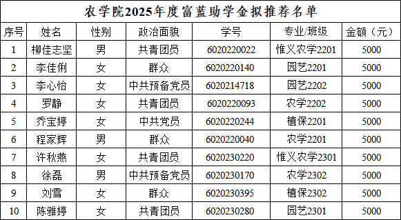 经学生本人申请,学院经学生本人申请,学院初审,农学院2025年富蓝助学金已完成初评、现将农学院2025年度富蓝助学金拟推荐名单进行公示,公示时间:2025年12月24日-2025年12月26日,如有疑问,请至农学院学生工作办公室211/235反馈,或通过以下渠道反馈:电话 0791-83813014 邮箱:nongxueyuanxinfang@jxau.edu.cn。