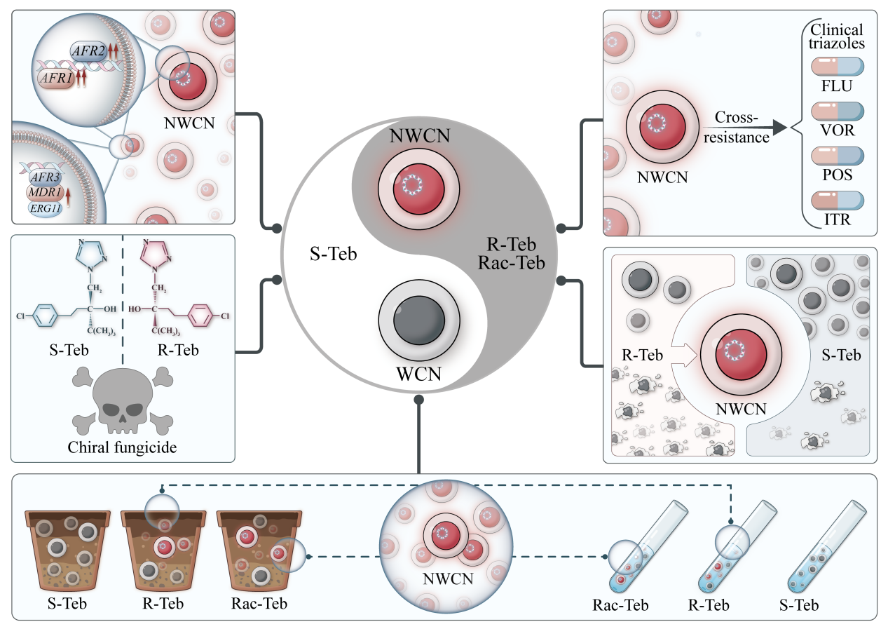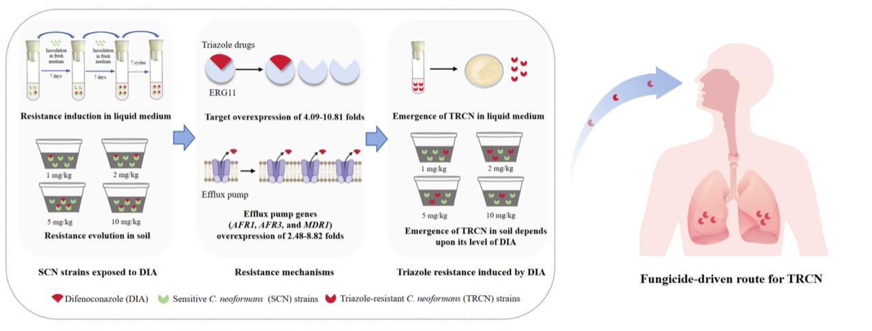 近日,我院植物化学与植物源农药研究团队青年教师曹端韬在杀菌剂残留与新生隐球菌抗性研究中取得重要进展。主要成果分别发表在国际知名期刊《Journal of Hazardous Materials》(IF=11.3,中科院1区)、《Journal of Agricultural and Food Chemistry》(IF=6.2,中科院1区)和Antimicrobial Agents and Chemotherapy (IF=4.5,中科院2区)上。其中团队彭文文副教授、傅小香副教授为共同第一作者,曹端韬青年副教授为唯一通讯作者。该系列研究核心结果为:(1)真实风险:即使在推荐剂量下,土壤中残留的杀菌剂也能形成持续选择压力,诱导抗药菌株出现;(2)剂量效应:抗药菌株的出现频率与杀菌剂残留浓度正相关,残留越高,风险越大;(3)手性选择性:对于手性杀菌剂(如戊唑醇),其R-对映体因更强的杀菌活性,诱导抗性的能力远超另一对映体;(4)独特机制:耐药性主要源于药物靶酶和外排泵基因的协同过表达,这是一种无需基因突变即可快速建立的稳定耐药机制。这些研究为认识和控制新生隐球菌抗药性提供新思路,有助于从农药应用角度提出预防抗药性新生隐球菌的新途径。